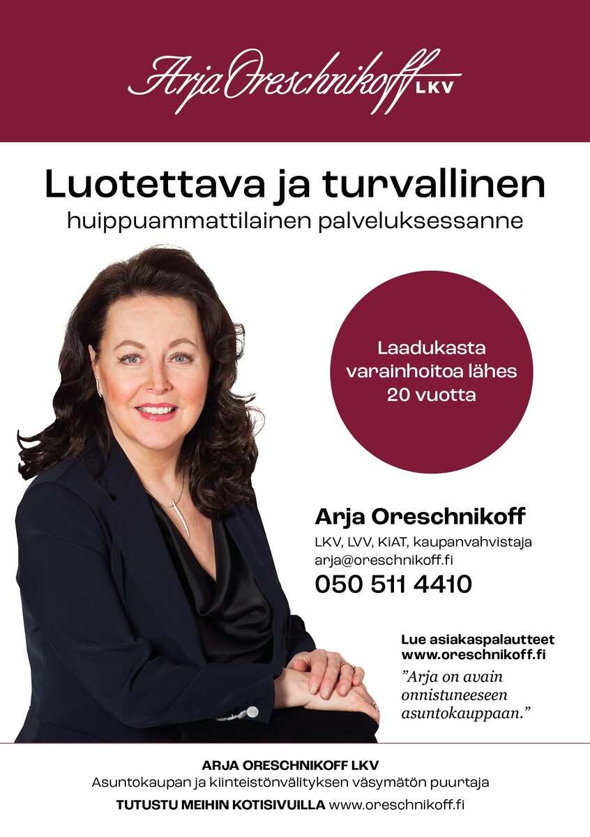 MYYNTI LKV ARJA ORESCHNIKOFF, puhelin 050 511 4410 tai arja@oreschnikoff.fi