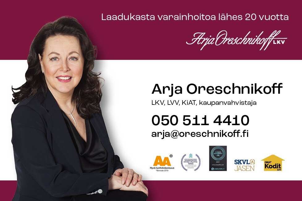 Arja Oreschnikoff LKV | A Oreschnikoff Oy Lautatarhankatu 10, 00580 Helsinki arja@oreschnikoff.fi 050-5114410 |