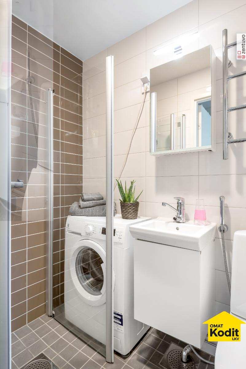 Kylpyhuone | Varusteet: suihkuseinä, pesukoneliitäntä, wc-istuin, suihku, peilikaappi Seinät: kaakeli Lattia: laatta |