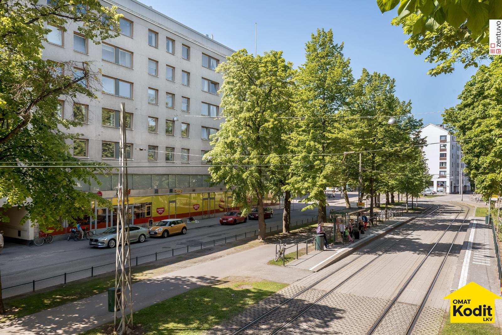 Hissillinen yhtiö on hyvin hoidettu, yhtiössä mm. sauna/uima-allasosasto asukkaiden käytössä erillistä maksua vastaan. Taloyhtiön kivijalassa ruokakauppa ja edessä raitiovaunupysäkki. Tämä ylimmän kerroksen huoneisto avautuu sisäpihalle, länteen, eikä kaupungin äänet tänne häiritsevästi yllä. Taloyhtiöllä myös pesutupa ja kuivaushuone sekä useampi polkupyörävarasto asukkaiden käytettävissä.