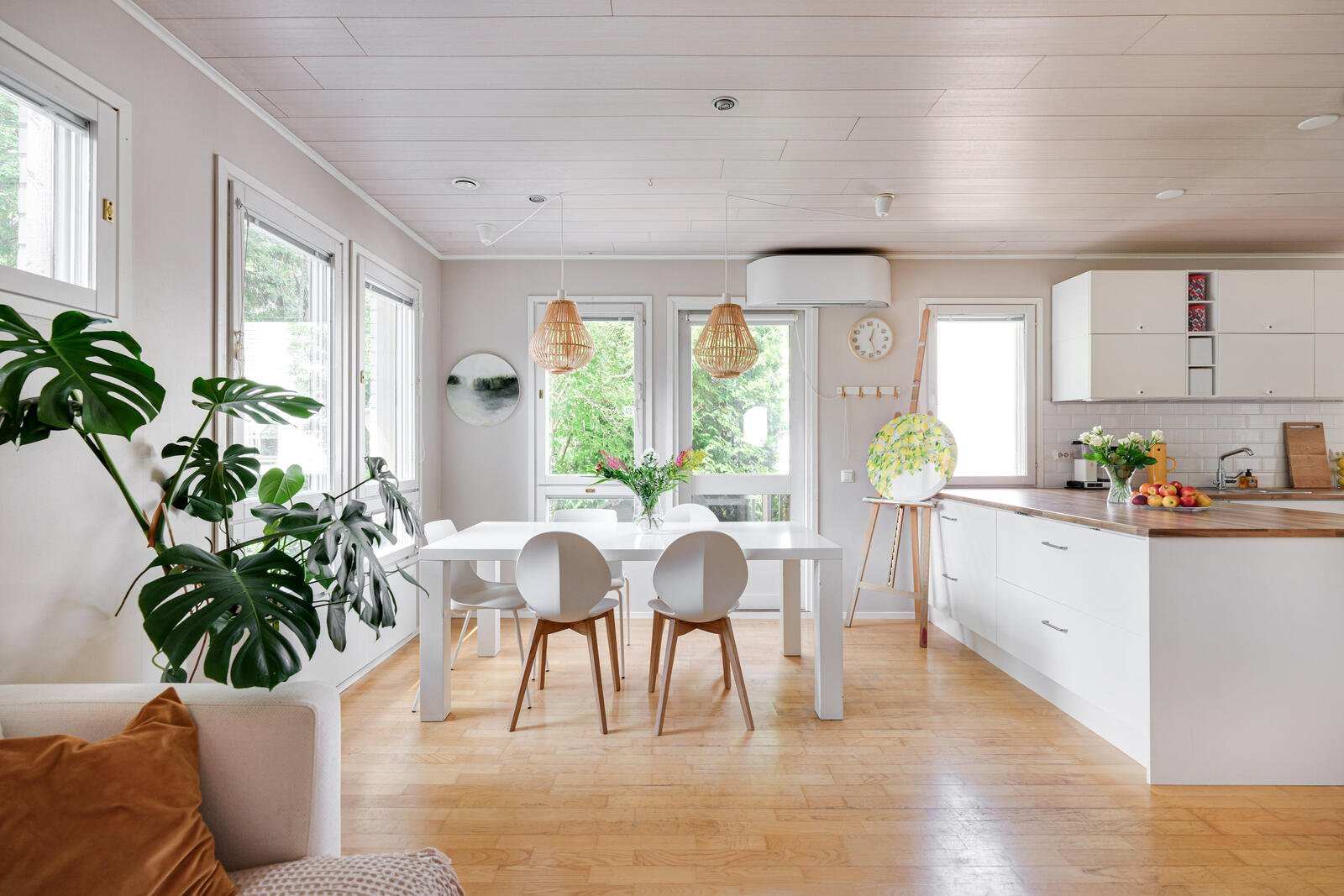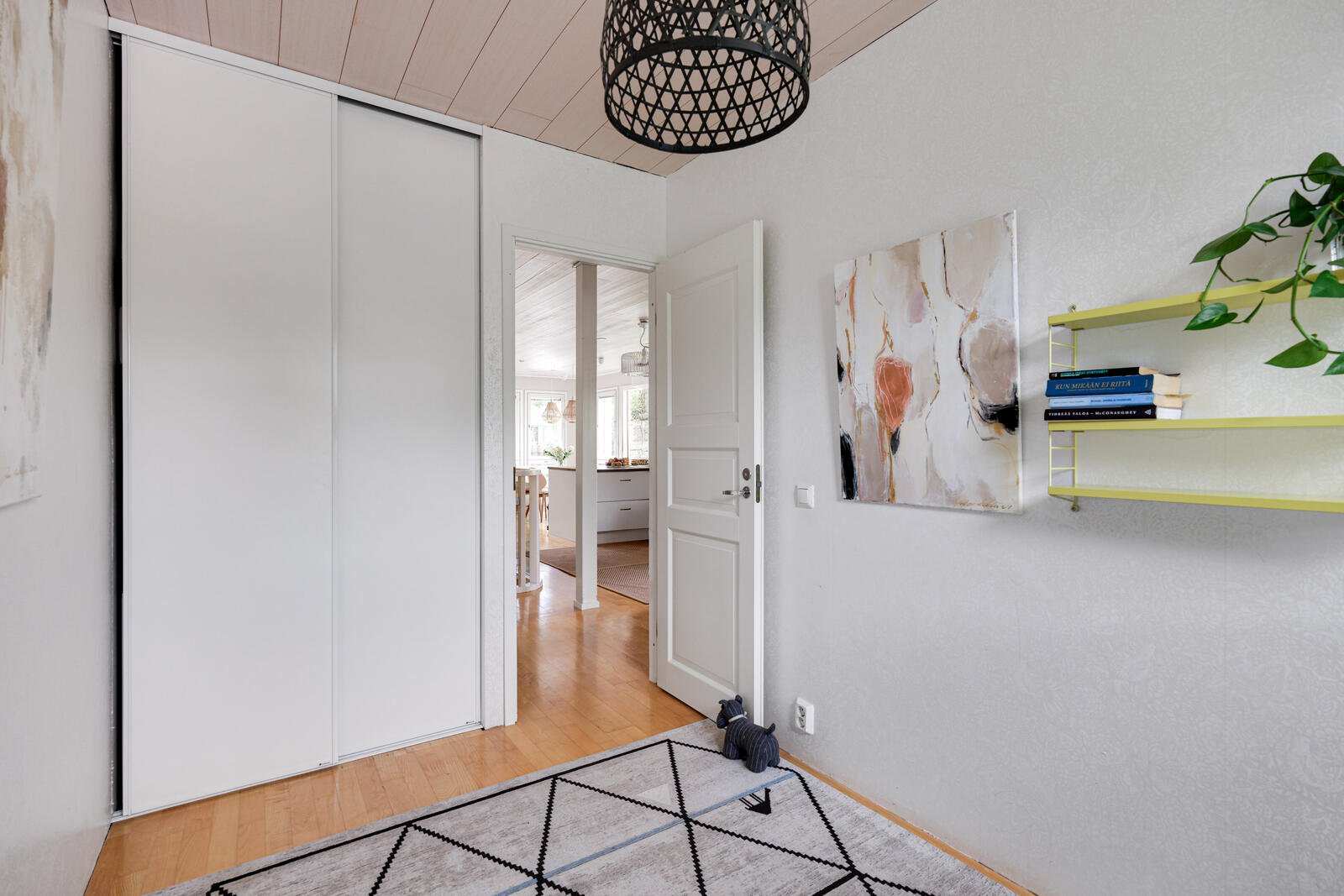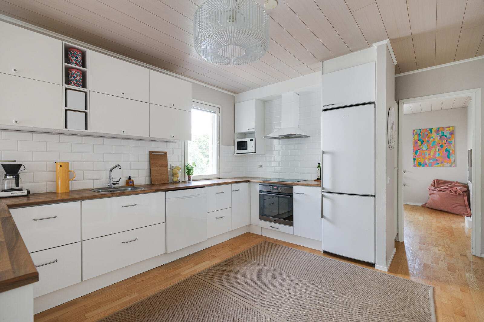 | Keittiön varustus | Avokeittiö, jossa valkoiset kaapistot, jääkaappi/pakastin, keraaminen induktioliesi, liesituuletin, kiertoilmauuni ja astianpesukone. Lattia parkettia ja osittain laatoitettu. Keittiön välitila laatoitettu vuonna 2020. |