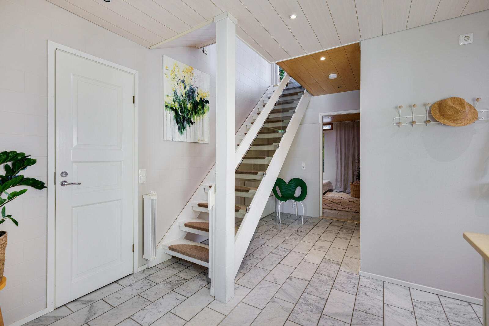 | Tilojen kuvaus | Sisääntulon alue laatoitettu ja seinät maalattu. Alakerrassa askarteluhuone, joka toimii vierashuoneena. Laattalattia ja seinät maalattu. Käynti huoneiston varastotilaan. |