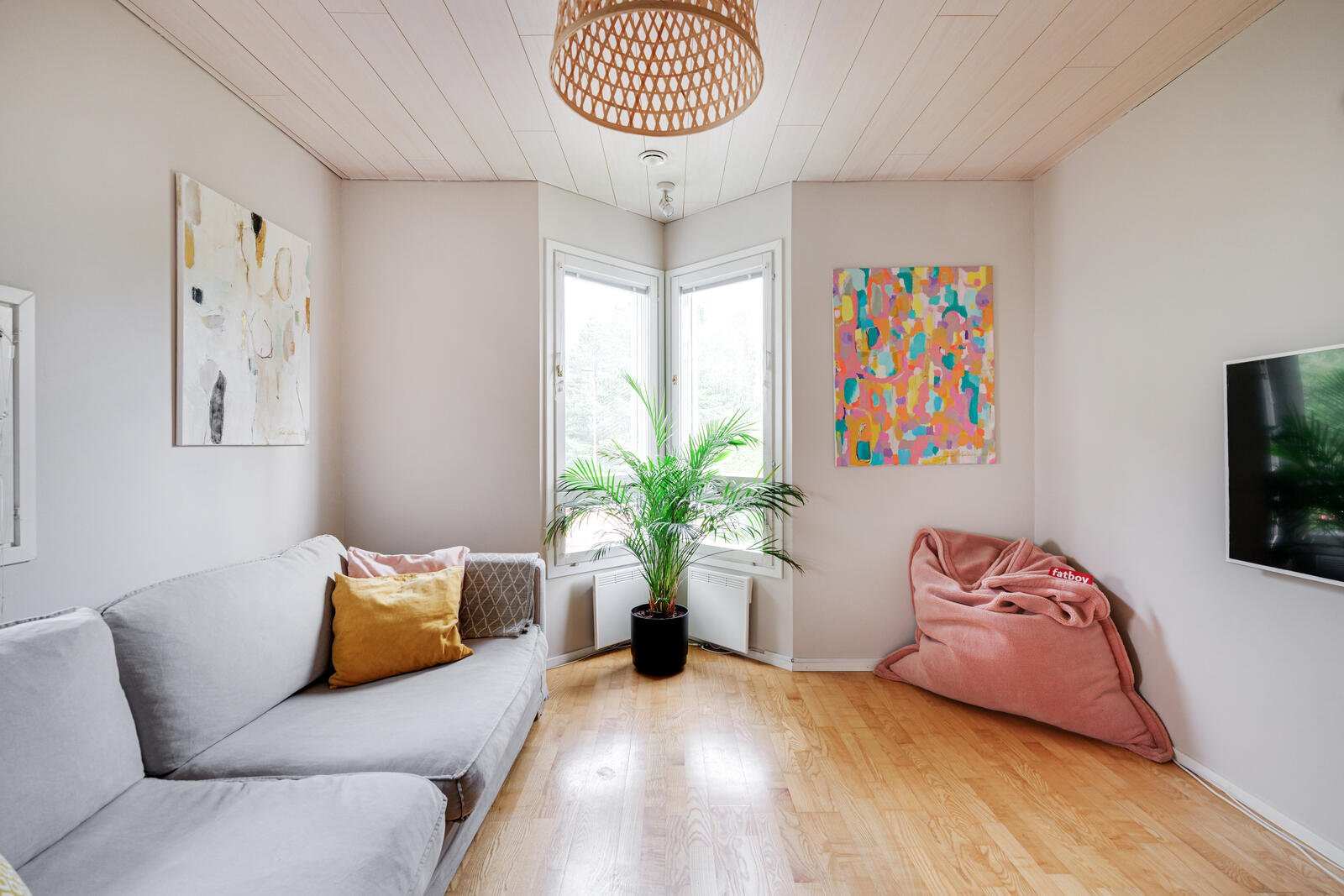 | Olohuone | Olohuone/ruokailutila ja avokeittiö muodostavat yhtenäisen kokonaisuuden. Ruokailutilasta käynti myös omalle pihalle. Parkettilattia (osittain kulunut) ja seinät maalattu. |