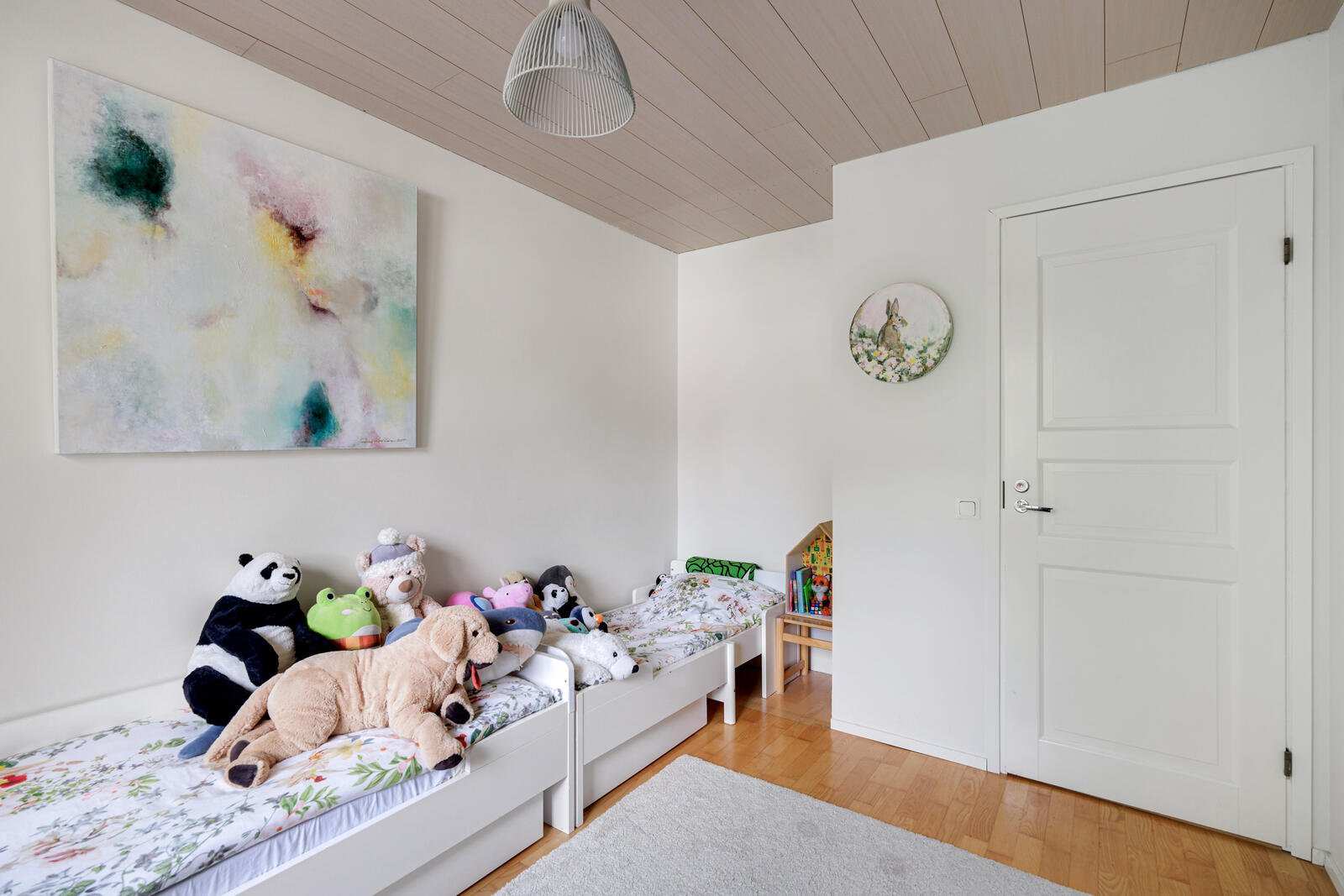 | Makuuhuone | Makuuhuoneissa parkettilattia ja seinät maalattu. Kaksi makuuhuonetta alhaalla ja kaksi ylhäällä. |